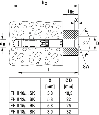 Высокоэффективный анкер FH II-SK с потайной головкой изготовлен из оцинкованной и нержавеющей стали и представляет собой втулочный анкер для эстетического крепления. FH II-SK идеально подходит для крепления перил, стальных конструкций и лестниц в бетоне с трещинами и без трещин. ЕТА и сертификат огнестойкости R 120 гарантируют дополнительную надежность. Кроме того, международные сертификаты регламентируют монтаж в районах с сейсмической активностью (категории C1 и C2) Анкер устанавливается заподлицо и позволяет сэкономить время при сквозном монтаже. Во время затяжки конус перемещается в распорную втулку и расширяет ее, прижимая к стенкам просверленного отверстия. Черное пластиковое кольцо предотвращает проворачивание анкера при затяжке и действует как зона смятия, воспринимающая проскальзывание под действием крутящего момента, благодаря чему закрепляемое изделие притягивается к базовому материалу.